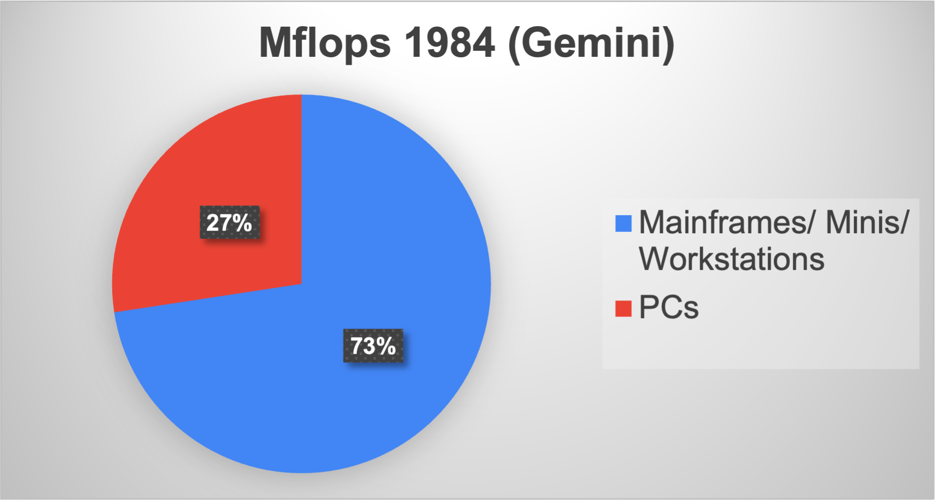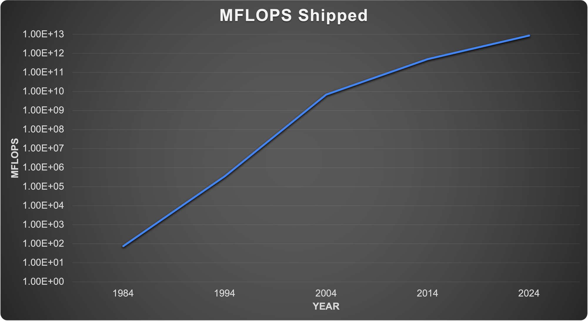 The total compute power shipped that year — the sum of the computing power of every computer shipped in the entire global market — was about 75-100 MFLOPS. By the way, your phone has WAY more compute power than the entire world had in 1984, orders of magnitude more power. We have seen an 11 orders of magnitude increase in world compute power during my working career — absolutely stunning.