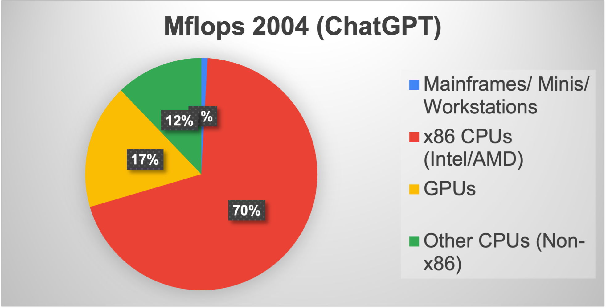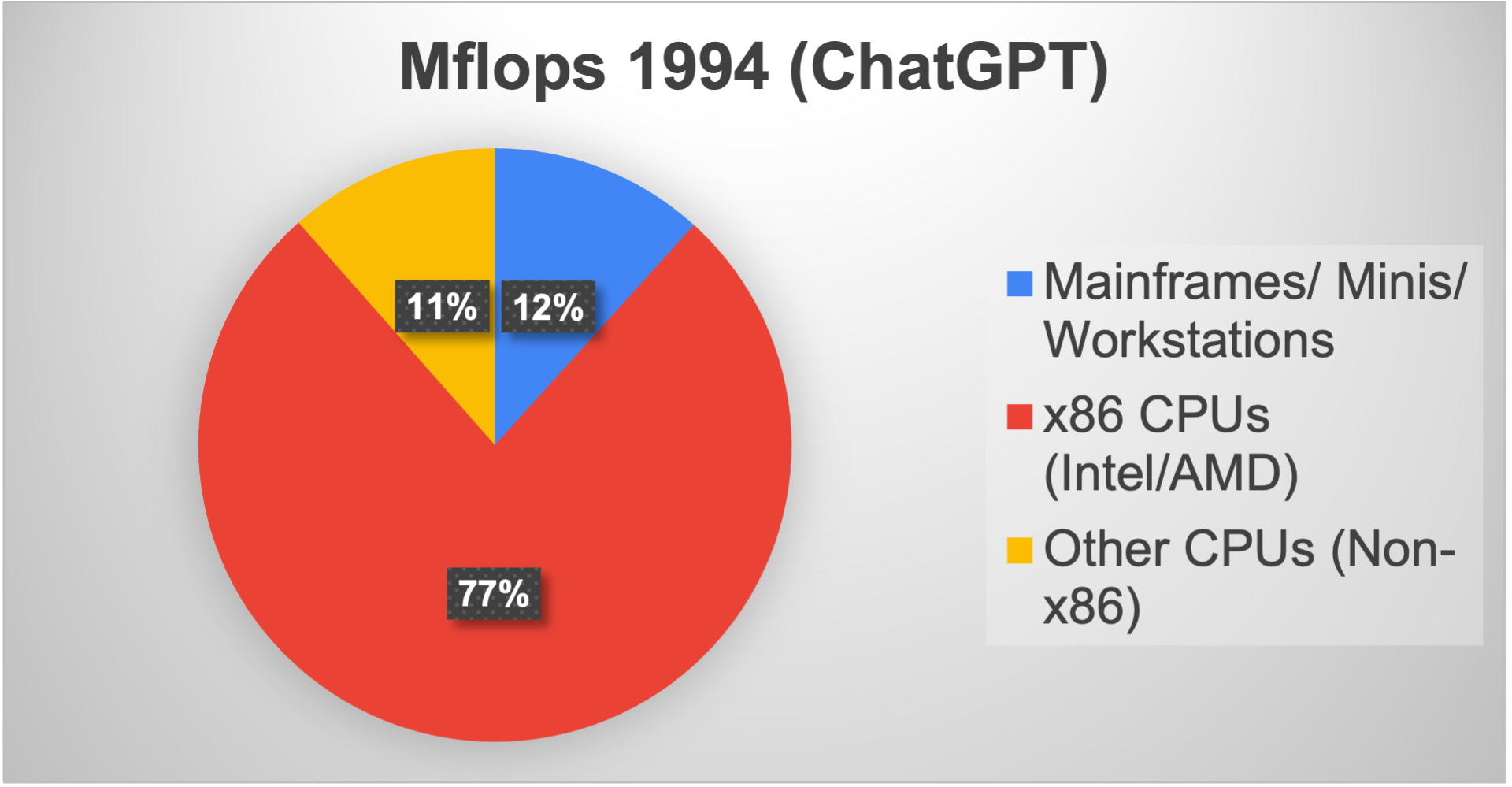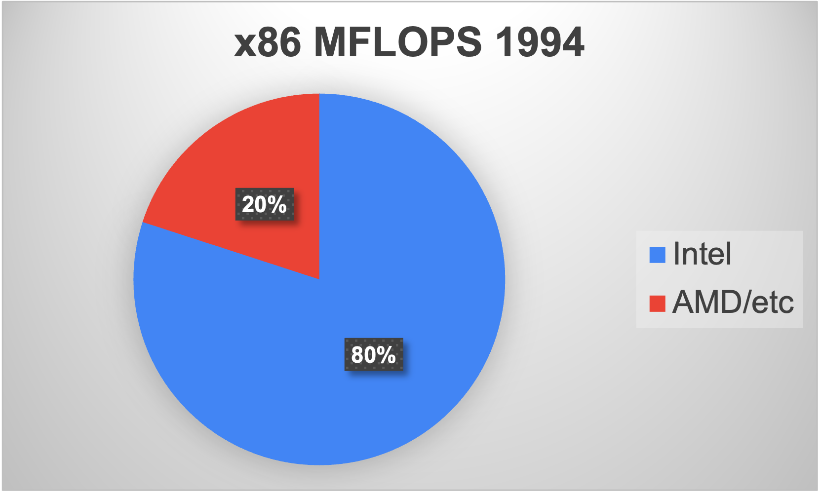 Twenty percent of the x86 MFLOPs were provided by non-Intel chips, including AMD. The massive success of Intel attracted brains and money. Work was definitely underway on ARM processors, although they had not yet made a significant dent in the market.