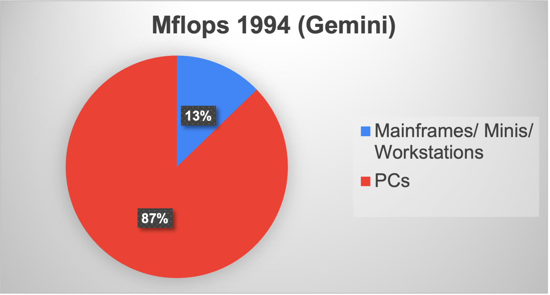 By 1994, Windows 3.x was in the market, Windows 95 was nearing release, and the PC was absolutely the king of the market. Mainframes, minis, and workstations were holding onto their legacy positions, but the writing was on the wall. The minicomputer business was nearly dead; in 4 years, DEC would be out of business, acquired by Compaq. GPUs were still nonexistent in the market. Smartphones didn’t exist. It was an Intel instruction set world.