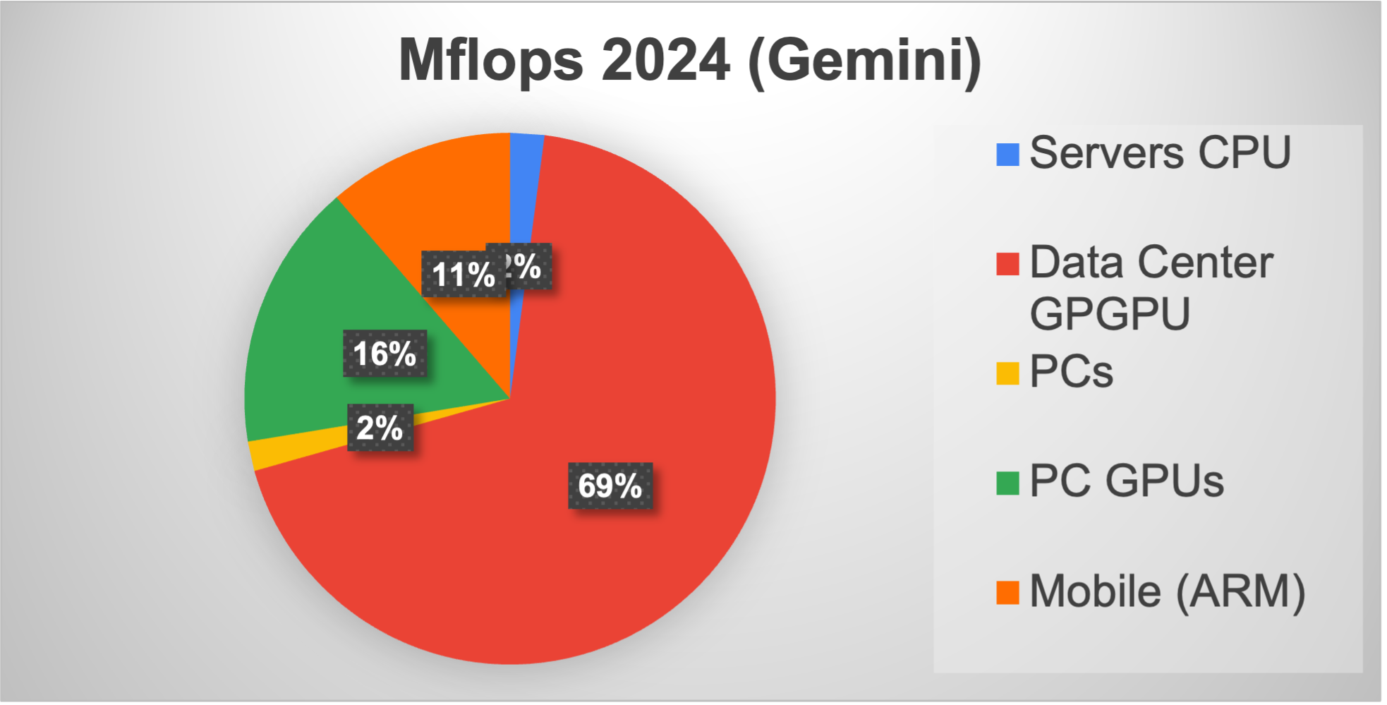 And by 2024, AI has pushed GPUs into the data center, and the industry supply of MFLOPs is dominated by GPUs on clients and on the backend. NVIDIA represents 70-80% of the GPU MFlops volume, and this market is attracting entrants from all sides.