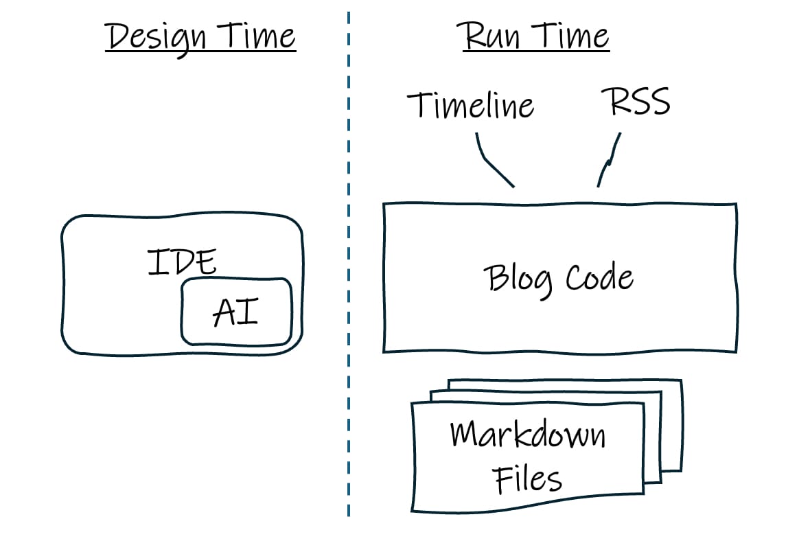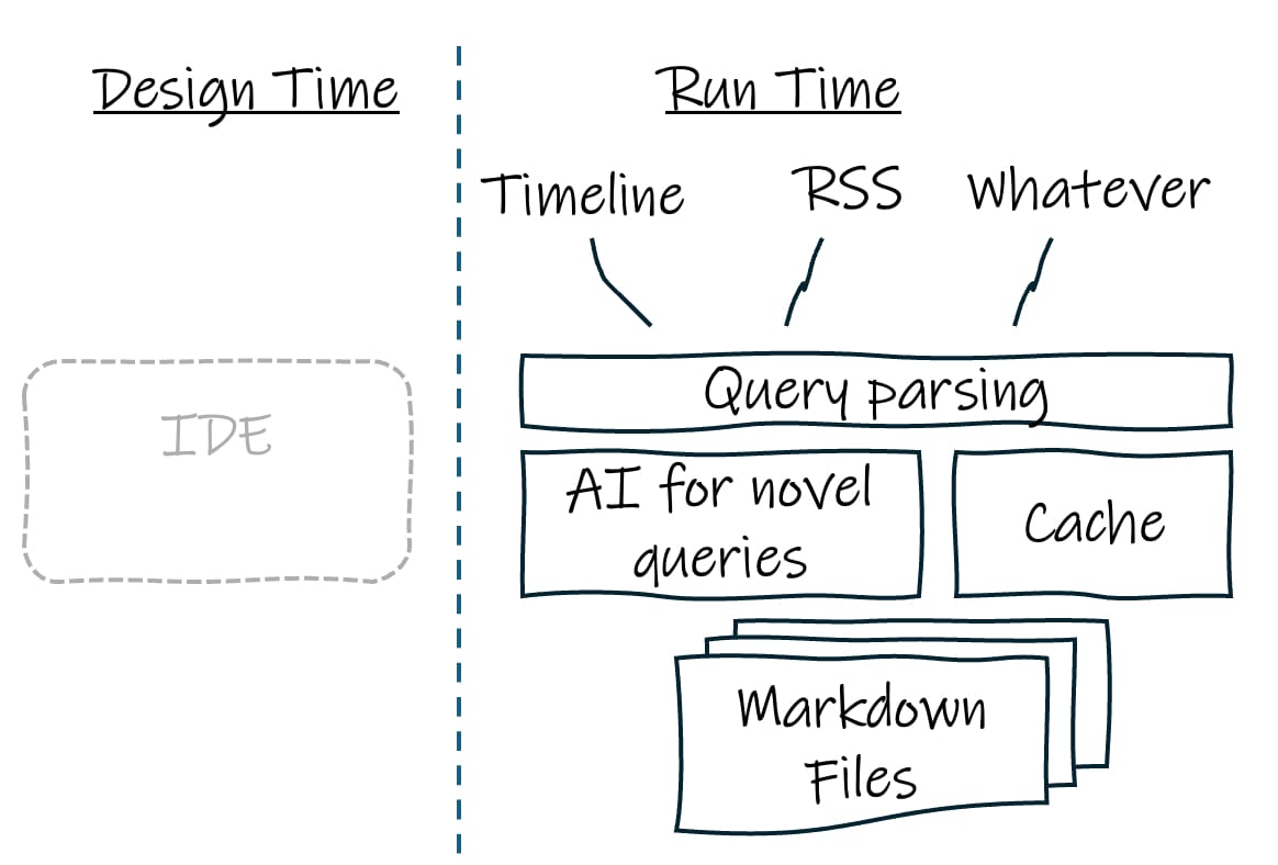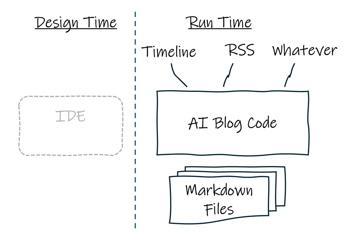 I don’t want an AI-generated code base to maintain — I want to get out of the business of writing and maintaining blog code altogether. What I want is a pure AI runtime with basically no code from me. I should be able to ask my blog any question about its content and get a great view of the blog in return. I should not have to imagine all my possible queries and views at design time — the AI engine should handle that on the fly. IDE usage could largely fade away, or be very limited to selecting the AI tool and tweaking the system prompt.