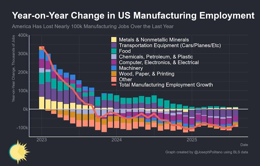 First, a chart about US manufacturing employment, asserting that we’ve lost 100K manufacturing jobs over the last year, from Joey Politano. Initially this chart seems attractive, but I'm unable to understand what it's saying. I need the subheadline to tell me what it means. And even with that hint, I still have problems parsing all the elements of this chart.