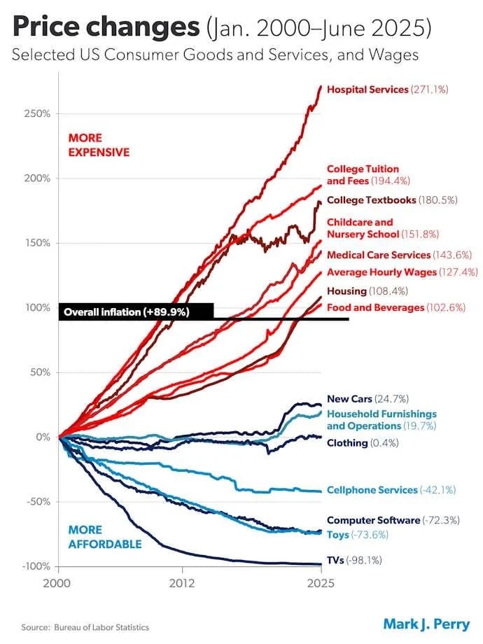 The costs of services, in many cases essential services, are an increasing burden for everyone. The prices of stuff — cars, appliances, clothing, tech — generally are performing well. But the costs of healthcare, education, childcare, and housing — these have moved in the wrong direction for people. We need dramatic reductions in these costs or dramatic increases in household income.